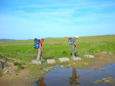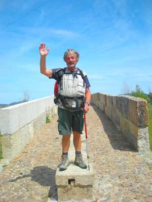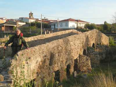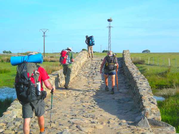 Les pèlerins sur le "Puente de Santiago" à 3 km avant d'arriver à Aldea del Cano