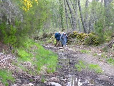 La sortie de la ville est un peu hasardeuse, mais finalement je décide de marcher le long de la N-525 que je vais suivre jusqu'à Requejo. Cela m'évite les chemins boueux du matin et des détours inutiles, car après la longue étape d'hier il me faut ménager mes forces. Après Requejo je retrouve le Camino qui passe au milieu de beaux paysages avec des torrents, des hêtres et des sapins...