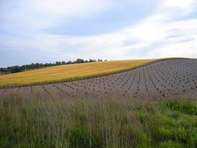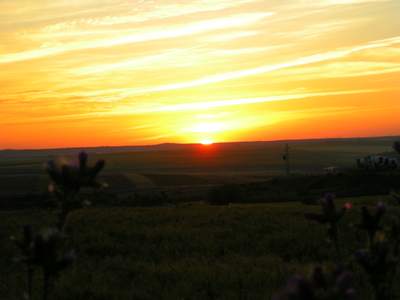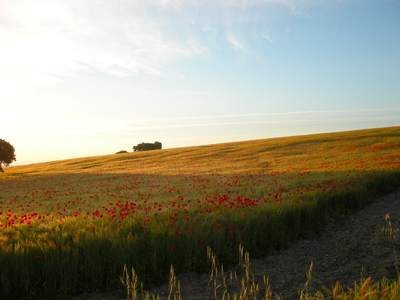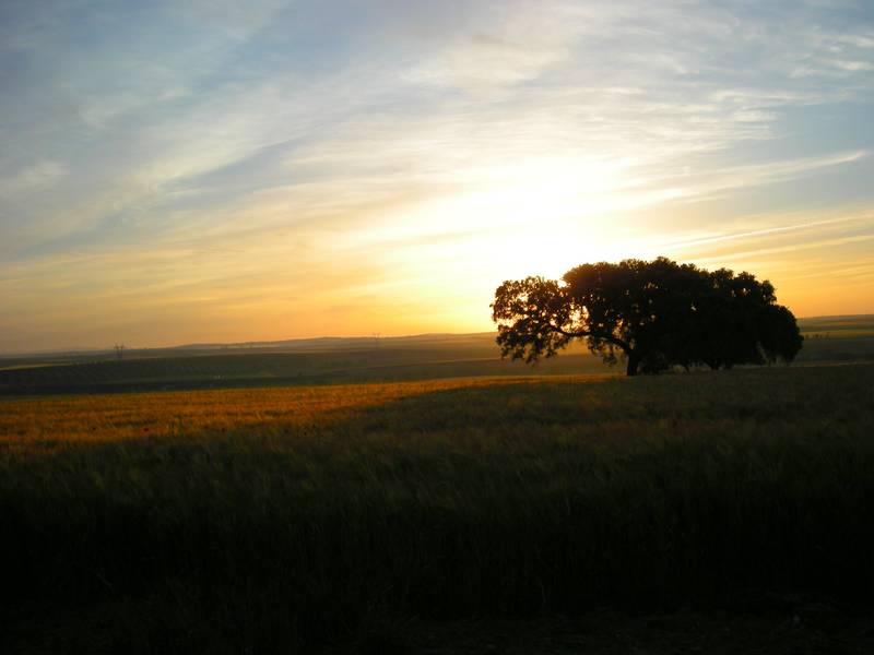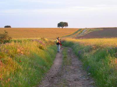 Nous quittons l'auberge avec Raphaël, un pèlerin espagnol de Madrid alors qu'il fait encore nuit. Marcher ainsi dans ces premières lueurs de l'aube me procure une joie profonde. C'est dans ces moments que je communie le plus intensément avec la Nature. Le Chemin passe au milieu de grandes étendues cultivées, céréales, vignes et oliviers. Le paysage est vaste et le soleil levant l'éclaire de belles couleurs. Je laisse Raphaël partir devant afin de continuer à mon rythme. Arrivé à Calzadilla de los Barros, j'espère trouver un bar ouvert afin de prendre un petit-déjeuner, malheureusement, tous les bars sont fermés!...
