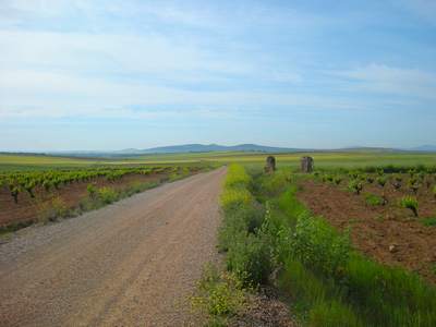 Le chemin de terre est assez large et il y a encore quelques rios à traverser. On côtoie pendant 1 km la nationale, puis à nouveau le Chemin s'allonge à travers champs sous un beau soleil qui commence à chauffer ! J'apprends en espagnol le poème de Pablo Neruda "Bella" (En Français dans la page précédente).