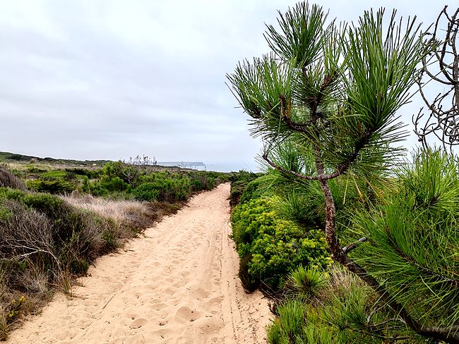 d'eucalyptus et commence à descendre en serpentant jusqu'à une plage