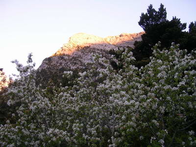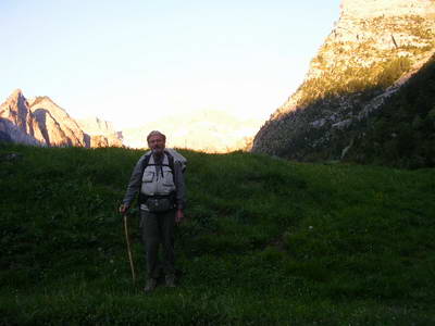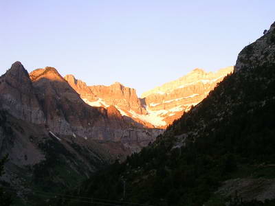 Le soleil fait resplendir les sommets des Pyrénées quand je commence la descente