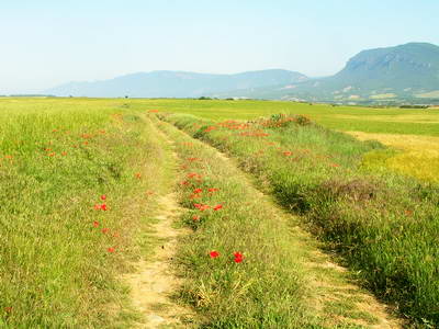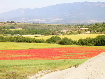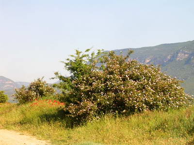 Les chemins sont bordés de milliers d'églantiers en fleurs, vaste roseraie sauvage, et les champs couverts de coquelicots.