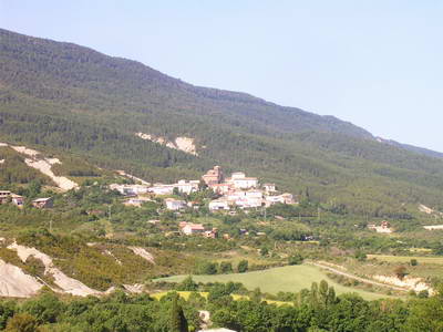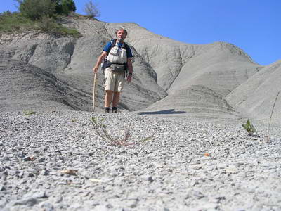 Je fais une "pose" devant ces monticules de marne bleue J'ai dépassé le village de Mianos que l'on voit par son autre face