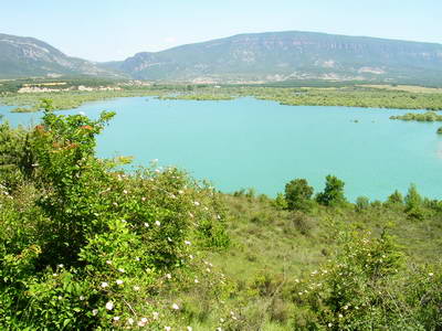 Le village d'Artieda apparaît au milieu des églantiers en fleurs 10 km avant Ruesta apparaît ce beau lac "Embalse de Yesa"