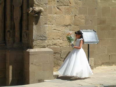 Une communiante dans sa belle robe blanche arrive telle une colombe...