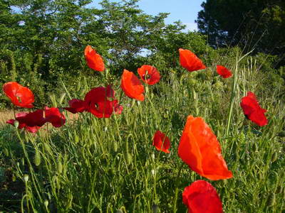 Entre Saint-Gilles et Gallargues, les vergers alternent avec les champs de coquelicots