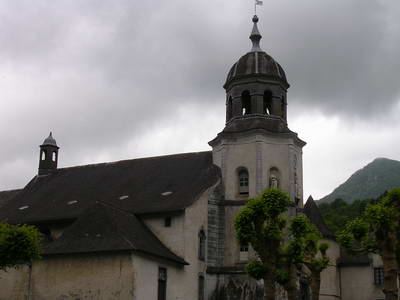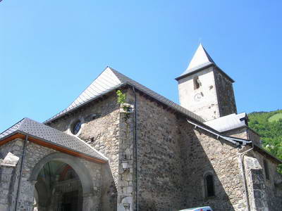 La façade de l'église Sainte-Croix L'église de Sarrance avec son haut clocher galbé