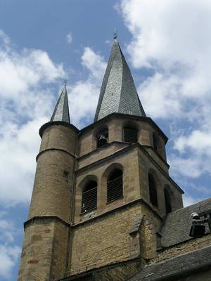 Eglise Saint-Côme-et-Saint-Damien (13 ème siècle) remarquable par son clocher flaminé, en vrille |