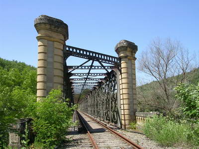 Le pont de l'ancienne voie de chemin de fer sur le Lot Vue sur la vallée du Lot depuis le village de Saint-Cirq-Lapopie