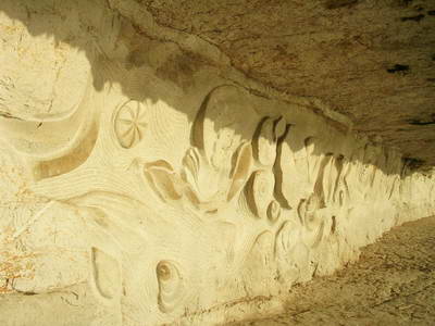 Retour par le chemin de halage taillé dans le rocher Bas-relief daté de 1989, oeuvre du sculpteur D. Monnier