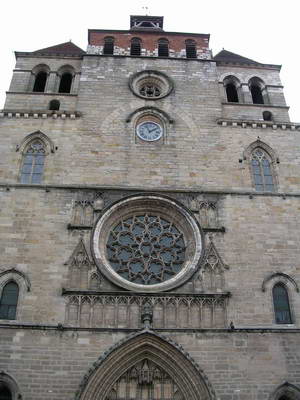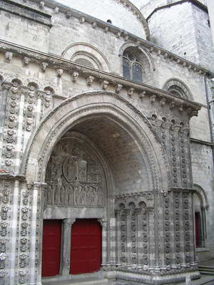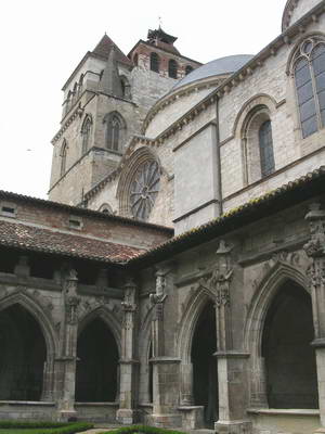 Façade fortifiée, chœur et absides gothiques, chapelles flamboyantes, cloître gothique et portail roman (1150)