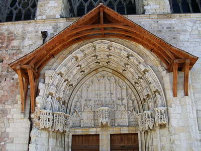 Personnages et anges sculptés dans les niches du portail Gothique flamboyant avec voûtes aux clefs ornées et