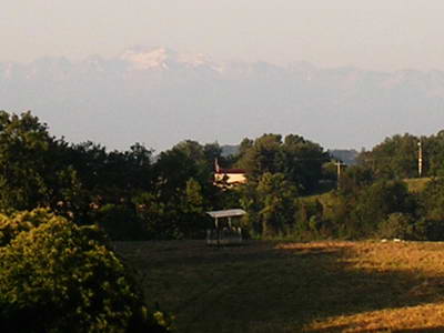 On part tous les trois de bonne heure, à la fraîcheur du matin. La chaîne des Pyrénées apparaît dans le lointain, moment d'émotion en pensant que dans quelques jours on sera là-haut...