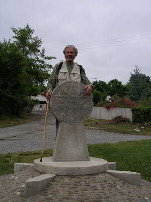 En sortant du gîte, je prends le raccourci par Etcharry. Je marche seul, je me sens bien. Je visite une belle petite chapelle à Olhaïby, avec un beau rétable en bois doré. Un peu plus loin, je retrouve la famille Suisse, Erika et Ernst. On prend ensuite la variante de "L'escargot" et on s'arrête pour déjeuner à Uhartmixe. Ensuite on se dirige vers le hameau de Gibraltar où se trouve cette stèle ronde marquant la rencontre des différents chemins (Chemins du Puy, de Vézelay et de Tours) pour ne faire plus qu'un Chemin jusqu'à St Jean-Pied-de-Port.
