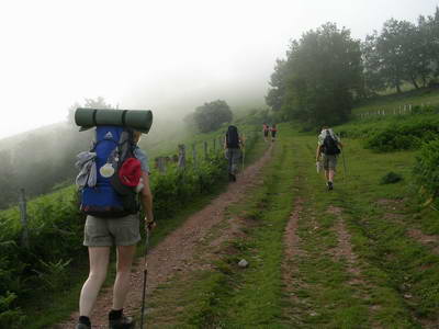 Je rencontre un jeune espagnol vraiment sympathique qui me propose de porter mon sac en plus du sien, ce qu'évidemment je ne peux accepter. Je rencontre 2 jeunes pèlerines, l'une hollandaise et l'autre finlandaise. Elles ont commencé le chemin à Saint-Jean-Pied-de-Port et c'est donc leur 2ème étape. Elles ont quelques problèmes de pieds et leurs sacs paraissent bien lourds (voir photo). Mais cependant je les rencontrerai plusieurs fois au cours des étapes suivantes et elles vont tout à fait assurer !