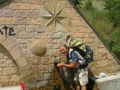 Nous nous arrêtons au premier col pour déjeuner, rejoints un peu plus tard par 3 jeunes suisses. Le soleil est fort, on cherche de l'ombre... Un peu plus loin, on arrive à la "Fontaine de Roland" (1344 m) où se trouve également une stèle indiquant Compostelle à 765 km. Il y a de l'eau fraîche qui est bien appréciée.