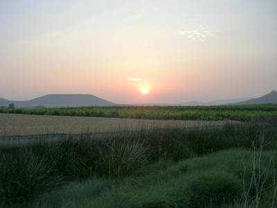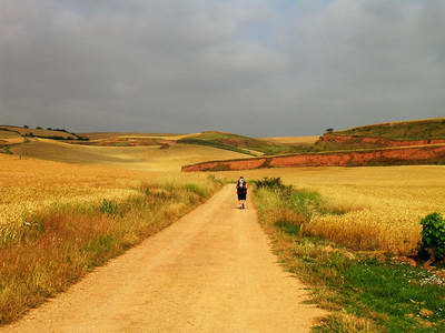 En quittant Najera au lever du jour..... Une pèlerine au loin dans ce beau décor de la Rioja