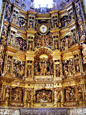 Dans la Cathédrale de Santo Domingo, beau rétable flamand ...et le poulailler avec la poule et le coq blancs vivants