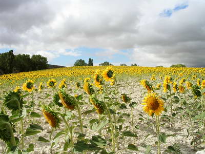 Je suis heureux de cette rencontre et m'émerveille devant ce champ de tournesols |