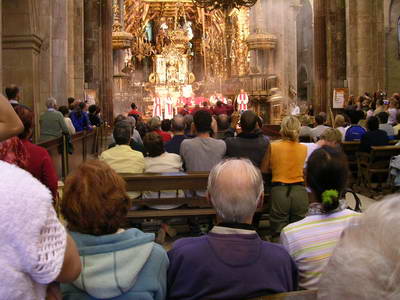 Après les photos qui s'imposent à ce moment exceptionnel, je rentre dans la Cathédrale prendre place pour la messe des pèlerins qui a lieu à midi. Il y a beaucoup de pèlerins venant des différents Chemins, et aussi malheureusement un peu trop de touristes. Je ressens une émotion profonde pendant la messe. A la fin de la messe, l'orgue joue à plein volume pendant que 8 "tiraboleiros", tout de rouge vêtus, élèvent l'énorme encensoir d'argent, le "Botafumeiro" à la force des bras, puis le projettent à travers le transept à une hauteur surprenante. C'est un moment vraiment impressionnant ! Ensuite, je vais au bureau des pèlerins chercher ma Compostella. Puis je me rends à la pension Sainte-Rita où j'ai réservé une chambre.